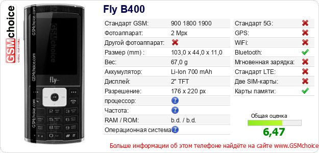 У Тебя есть свой сайт? Хочешь где-то разместить информацию о базовых данных мобильника Fly B400 ? Это запросто устроить. Достаточно скачать картинку или скопировать и разместить на соответствующем сайте нижерасположенный код:Размещение этого кода вызовет появление нижерасположенной картинки:
