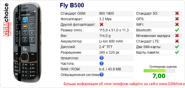 У Тебя есть свой сайт? Хочешь где-то разместить информацию о базовых данных мобильника Fly B500 ? Это запросто устроить. Достаточно скачать картинку или скопировать и разместить на соответствующем сайте нижерасположенный код:Размещение этого кода вызовет появление нижерасположенной картинки: