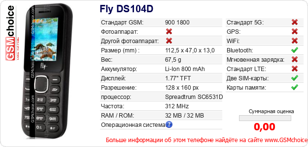У Тебя есть свой сайт? Хочешь где-то разместить информацию о базовых данных мобильника Fly DS104D ? Это запросто устроить. Достаточно скачать картинку или скопировать и разместить на соответствующем сайте нижерасположенный код:Размещение этого кода вызовет появление нижерасположенной картинки: