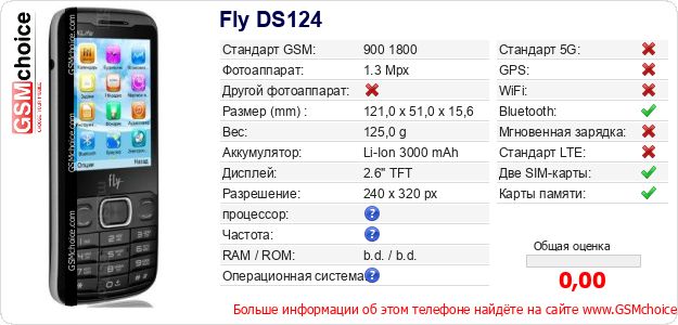 У Тебя есть свой сайт? Хочешь где-то разместить информацию о базовых данных мобильника Fly DS124 ? Это запросто устроить. Достаточно скачать картинку или скопировать и разместить на соответствующем сайте нижерасположенный код:Размещение этого кода вызовет появление нижерасположенной картинки: