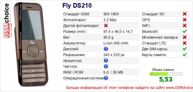 У Тебя есть свой сайт? Хочешь где-то разместить информацию о базовых данных мобильника Fly DS210 ? Это запросто устроить. Достаточно скачать картинку или скопировать и разместить на соответствующем сайте нижерасположенный код:Размещение этого кода вызовет появление нижерасположенной картинки: