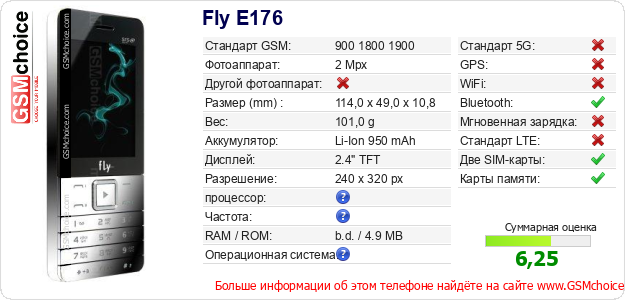 У Тебя есть свой сайт? Хочешь где-то разместить информацию о базовых данных мобильника Fly E176 ? Это запросто устроить. Достаточно скачать картинку или скопировать и разместить на соответствующем сайте нижерасположенный код:Размещение этого кода вызовет появление нижерасположенной картинки: