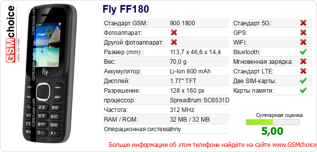 У Тебя есть свой сайт? Хочешь где-то разместить информацию о базовых данных мобильника Fly FF180 ? Это запросто устроить. Достаточно скачать картинку или скопировать и разместить на соответствующем сайте нижерасположенный код:Размещение этого кода вызовет появление нижерасположенной картинки: