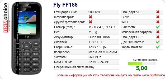 У Тебя есть свой сайт? Хочешь где-то разместить информацию о базовых данных мобильника Fly FF188 ? Это запросто устроить. Достаточно скачать картинку или скопировать и разместить на соответствующем сайте нижерасположенный код:Размещение этого кода вызовет появление нижерасположенной картинки: