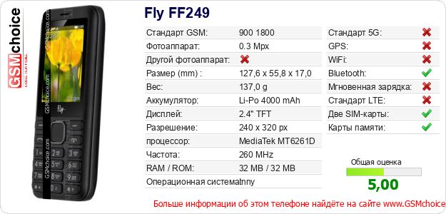 У Тебя есть свой сайт? Хочешь где-то разместить информацию о базовых данных мобильника Fly FF249 ? Это запросто устроить. Достаточно скачать картинку или скопировать и разместить на соответствующем сайте нижерасположенный код:Размещение этого кода вызовет появление нижерасположенной картинки: