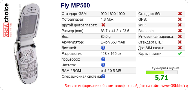 У Тебя есть свой сайт? Хочешь где-то разместить информацию о базовых данных мобильника Fly MP500 ? Это запросто устроить. Достаточно скачать картинку или скопировать и разместить на соответствующем сайте нижерасположенный код:Размещение этого кода вызовет появление нижерасположенной картинки: