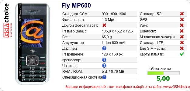 У Тебя есть свой сайт? Хочешь где-то разместить информацию о базовых данных мобильника Fly MP600 ? Это запросто устроить. Достаточно скачать картинку или скопировать и разместить на соответствующем сайте нижерасположенный код:Размещение этого кода вызовет появление нижерасположенной картинки: