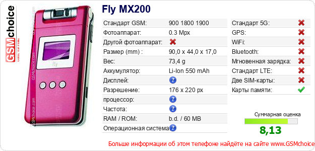 У Тебя есть свой сайт? Хочешь где-то разместить информацию о базовых данных мобильника Fly MX200 ? Это запросто устроить. Достаточно скачать картинку или скопировать и разместить на соответствующем сайте нижерасположенный код:Размещение этого кода вызовет появление нижерасположенной картинки: