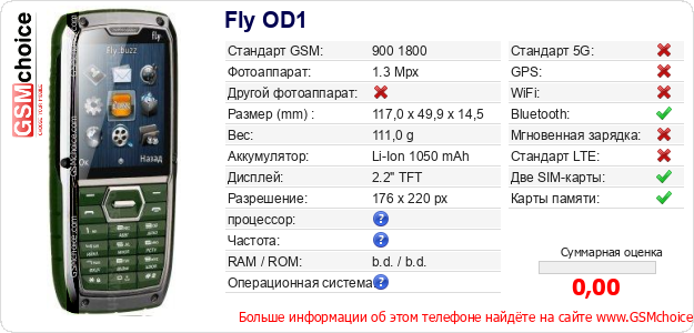 У Тебя есть свой сайт? Хочешь где-то разместить информацию о базовых данных мобильника Fly OD1 ? Это запросто устроить. Достаточно скачать картинку или скопировать и разместить на соответствующем сайте нижерасположенный код:Размещение этого кода вызовет появление нижерасположенной картинки: