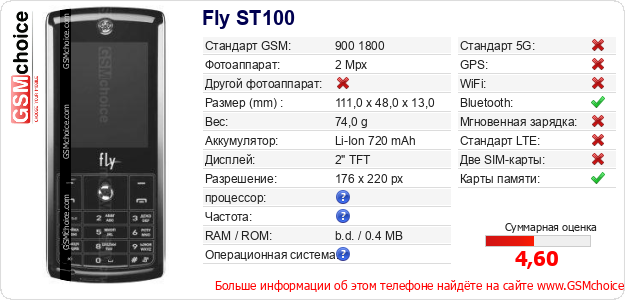 У Тебя есть свой сайт? Хочешь где-то разместить информацию о базовых данных мобильника Fly ST100 ? Это запросто устроить. Достаточно скачать картинку или скопировать и разместить на соответствующем сайте нижерасположенный код:Размещение этого кода вызовет появление нижерасположенной картинки: