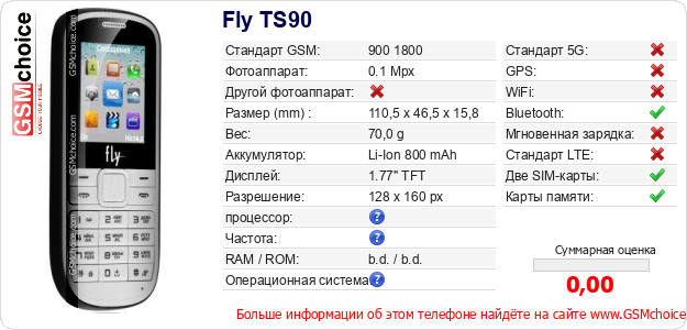 У Тебя есть свой сайт? Хочешь где-то разместить информацию о базовых данных мобильника Fly TS90 ? Это запросто устроить. Достаточно скачать картинку или скопировать и разместить на соответствующем сайте нижерасположенный код:Размещение этого кода вызовет появление нижерасположенной картинки: