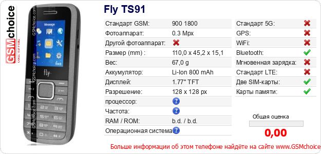 У Тебя есть свой сайт? Хочешь где-то разместить информацию о базовых данных мобильника Fly TS91 ? Это запросто устроить. Достаточно скачать картинку или скопировать и разместить на соответствующем сайте нижерасположенный код:Размещение этого кода вызовет появление нижерасположенной картинки: