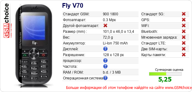 У Тебя есть свой сайт? Хочешь где-то разместить информацию о базовых данных мобильника Fly V70 ? Это запросто устроить. Достаточно скачать картинку или скопировать и разместить на соответствующем сайте нижерасположенный код:Размещение этого кода вызовет появление нижерасположенной картинки: