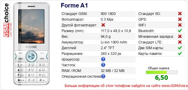 У Тебя есть свой сайт? Хочешь где-то разместить информацию о базовых данных мобильника Forme A1 ? Это запросто устроить. Достаточно скачать картинку или скопировать и разместить на соответствующем сайте нижерасположенный код:Размещение этого кода вызовет появление нижерасположенной картинки: