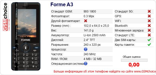 Данные о телефоне Forme A3 на Вашем сайте