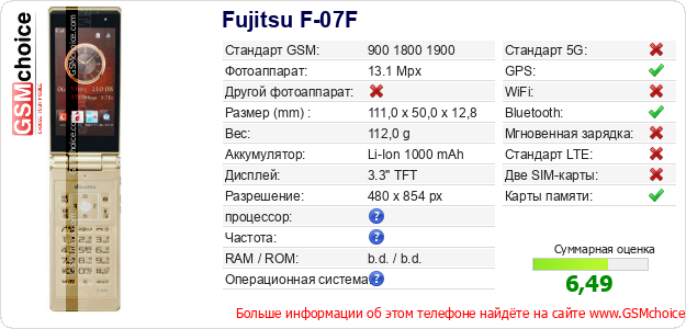 Данные о телефоне Fujitsu F-07F на Вашем сайте
