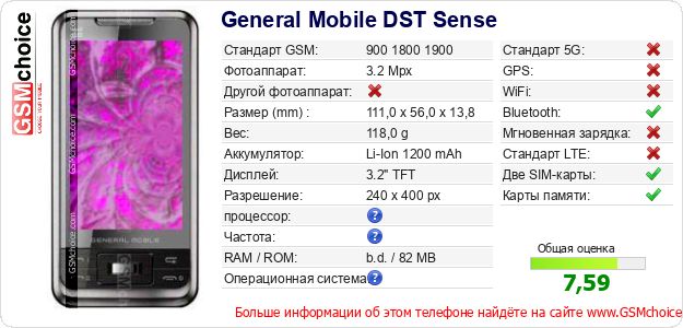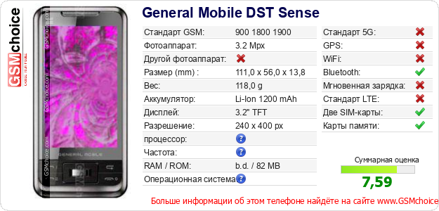 У Тебя есть свой сайт? Хочешь где-то разместить информацию о базовых данных мобильника General Mobile DST Sense ? Это запросто устроить. Достаточно скачать картинку или скопировать и разместить на соответствующем сайте нижерасположенный код:Размещение этого кода вызовет появление нижерасположенной картинки: