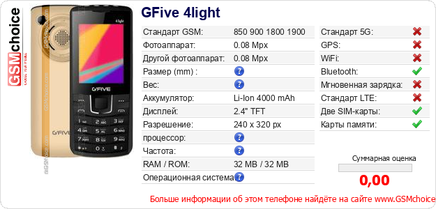 Данные о телефоне GFive 4light на Вашем сайте