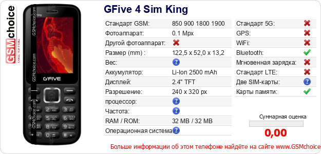 Данные о телефоне GFive 4 Sim King на Вашем сайте