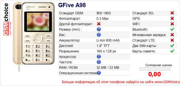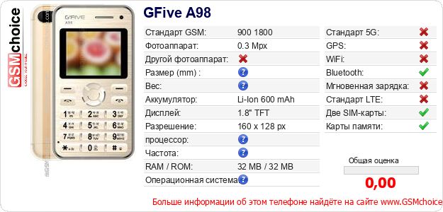 Данные о телефоне GFive A98 на Вашем сайте
