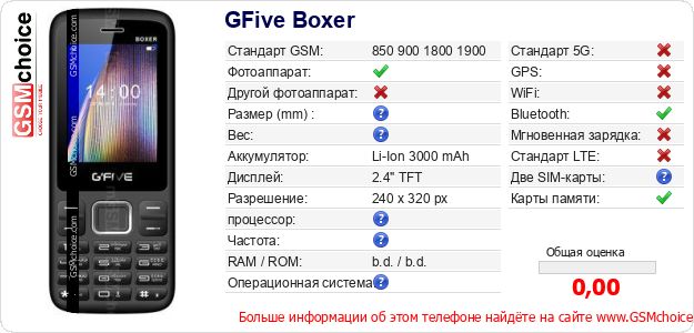 У Тебя есть свой сайт? Хочешь где-то разместить информацию о базовых данных мобильника GFive Boxer ? Это запросто устроить. Достаточно скачать картинку или скопировать и разместить на соответствующем сайте нижерасположенный код:Размещение этого кода вызовет появление нижерасположенной картинки: