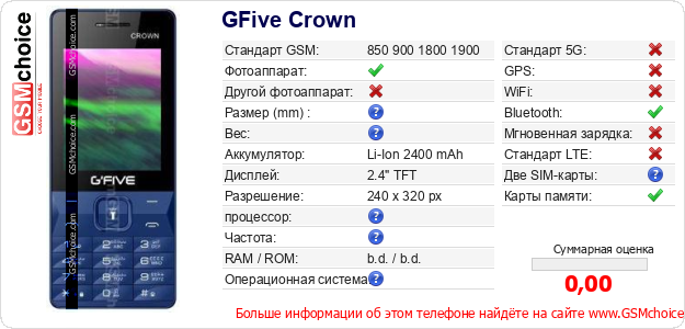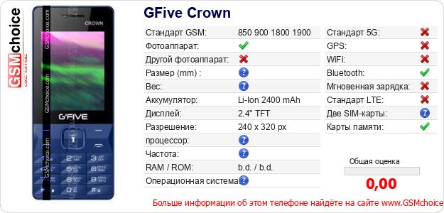 Данные о телефоне GFive Crown на Вашем сайте