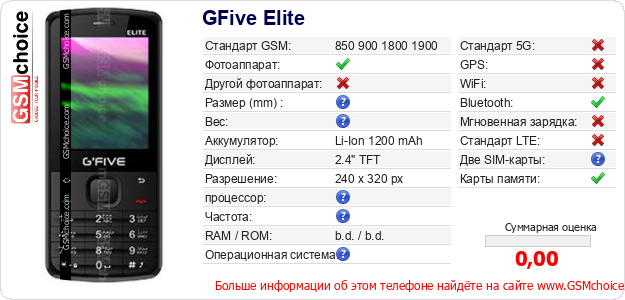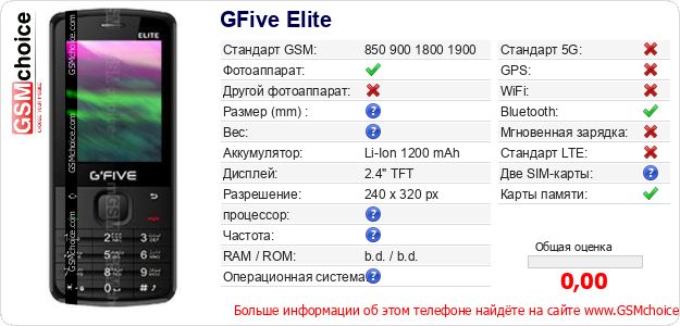 У Тебя есть свой сайт? Хочешь где-то разместить информацию о базовых данных мобильника GFive Elite ? Это запросто устроить. Достаточно скачать картинку или скопировать и разместить на соответствующем сайте нижерасположенный код:Размещение этого кода вызовет появление нижерасположенной картинки: