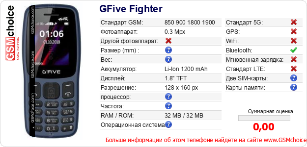 У Тебя есть свой сайт? Хочешь где-то разместить информацию о базовых данных мобильника GFive Fighter ? Это запросто устроить. Достаточно скачать картинку или скопировать и разместить на соответствующем сайте нижерасположенный код:Размещение этого кода вызовет появление нижерасположенной картинки: