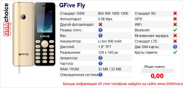 У Тебя есть свой сайт? Хочешь где-то разместить информацию о базовых данных мобильника GFive Fly ? Это запросто устроить. Достаточно скачать картинку или скопировать и разместить на соответствующем сайте нижерасположенный код:Размещение этого кода вызовет появление нижерасположенной картинки: