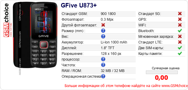 Данные о телефоне GFive U873+ на Вашем сайте