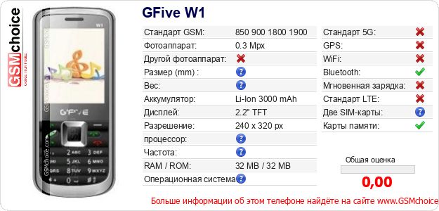 Данные о телефоне GFive W1 на Вашем сайте