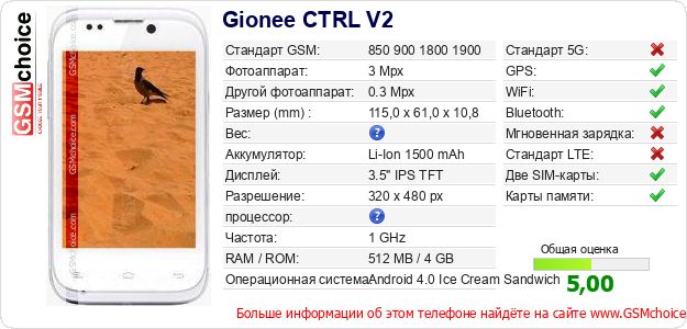Данные о телефоне Gionee CTRL V2 на Вашем сайте