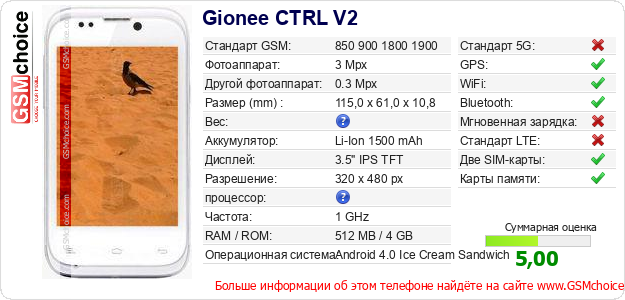 У Тебя есть свой сайт? Хочешь где-то разместить информацию о базовых данных мобильника Gionee CTRL V2 ? Это запросто устроить. Достаточно скачать картинку или скопировать и разместить на соответствующем сайте нижерасположенный код:Размещение этого кода вызовет появление нижерасположенной картинки: