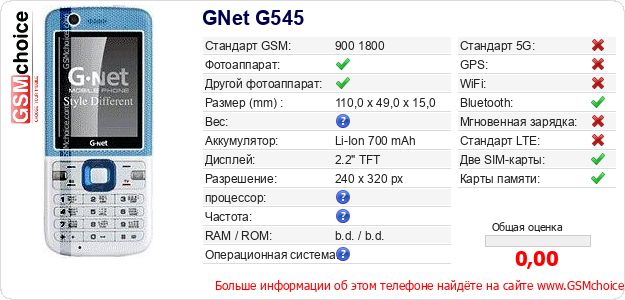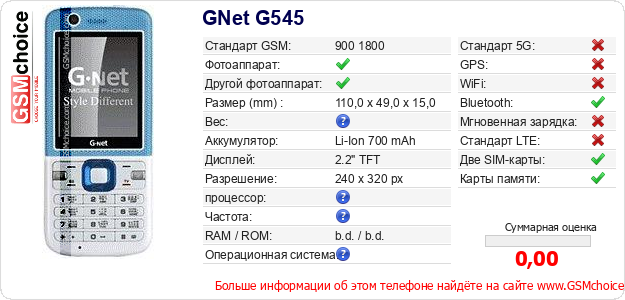 У Тебя есть свой сайт? Хочешь где-то разместить информацию о базовых данных мобильника GNet G545 ? Это запросто устроить. Достаточно скачать картинку или скопировать и разместить на соответствующем сайте нижерасположенный код:Размещение этого кода вызовет появление нижерасположенной картинки: