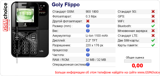 У Тебя есть свой сайт? Хочешь где-то разместить информацию о базовых данных мобильника Goly Flippo ? Это запросто устроить. Достаточно скачать картинку или скопировать и разместить на соответствующем сайте нижерасположенный код:Размещение этого кода вызовет появление нижерасположенной картинки:
