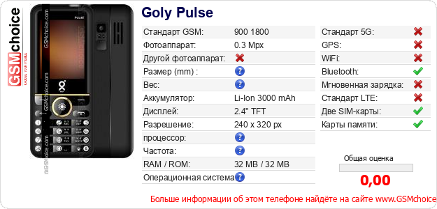 У Тебя есть свой сайт? Хочешь где-то разместить информацию о базовых данных мобильника Goly Pulse ? Это запросто устроить. Достаточно скачать картинку или скопировать и разместить на соответствующем сайте нижерасположенный код:Размещение этого кода вызовет появление нижерасположенной картинки: