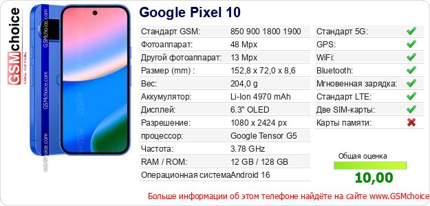 У Тебя есть свой сайт? Хочешь где-то разместить информацию о базовых данных мобильника Google Pixel 10 ? Это запросто устроить. Достаточно скачать картинку или скопировать и разместить на соответствующем сайте нижерасположенный код:Размещение этого кода вызовет появление нижерасположенной картинки: