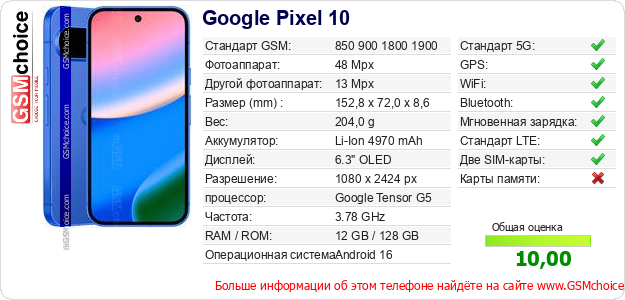 Данные о телефоне Google Pixel 10 на Вашем сайте