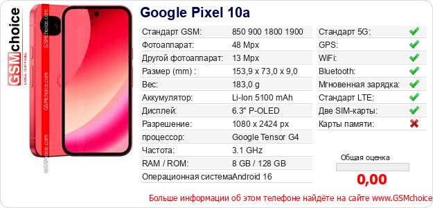 Данные о телефоне Google Pixel 10a на Вашем сайте