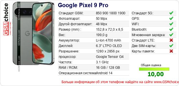 Данные о телефоне Google Pixel 9 Pro на Вашем сайте
