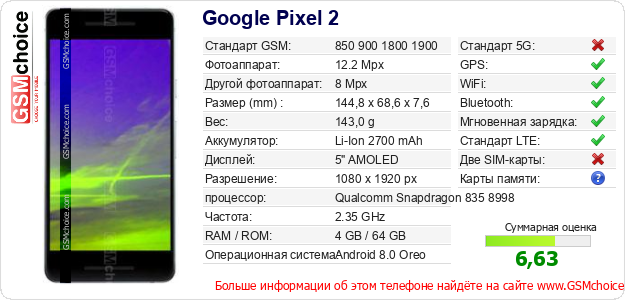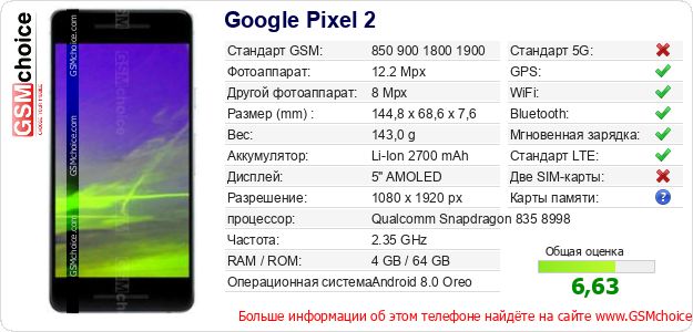 Данные о телефоне Google Pixel 2 на Вашем сайте
