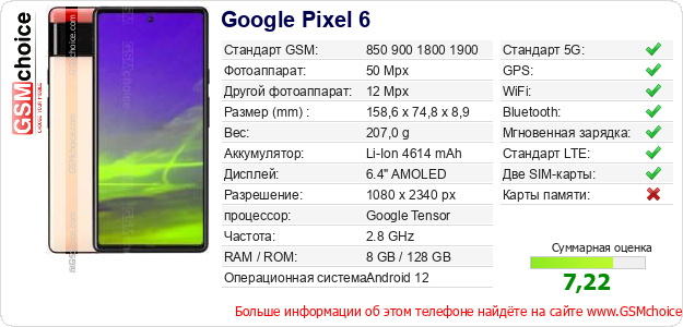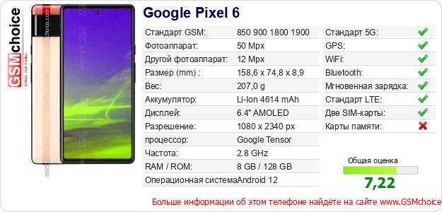 Данные о телефоне Google Pixel 6 на Вашем сайте