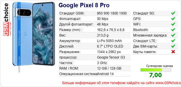Данные о телефоне Google Pixel 8 Pro на Вашем сайте