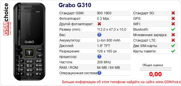 У Тебя есть свой сайт? Хочешь где-то разместить информацию о базовых данных мобильника Grabo G310 ? Это запросто устроить. Достаточно скачать картинку или скопировать и разместить на соответствующем сайте нижерасположенный код:Размещение этого кода вызовет появление нижерасположенной картинки: