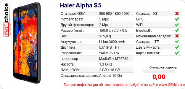 Данные о телефоне Haier Alpha S5 на Вашем сайте