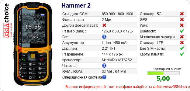 У Тебя есть свой сайт? Хочешь где-то разместить информацию о базовых данных мобильника Hammer 2 ? Это запросто устроить. Достаточно скачать картинку или скопировать и разместить на соответствующем сайте нижерасположенный код:Размещение этого кода вызовет появление нижерасположенной картинки: