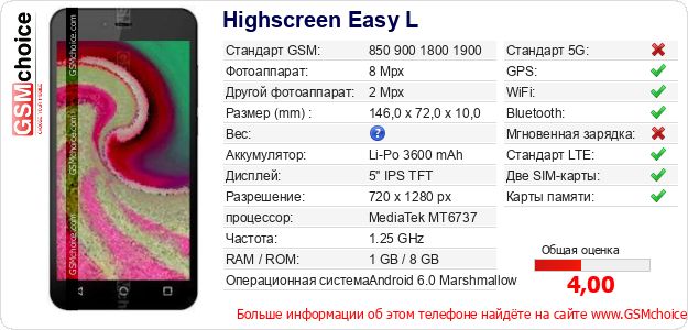 Данные о телефоне Highscreen Easy L на Вашем сайте