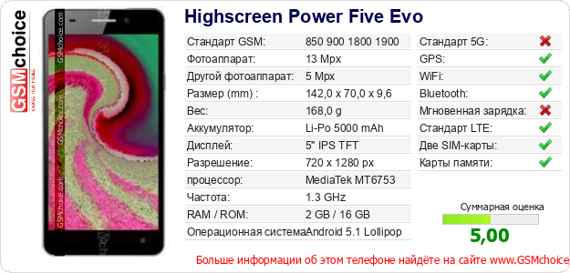 Данные о телефоне Highscreen Power Five Evo на Вашем сайте