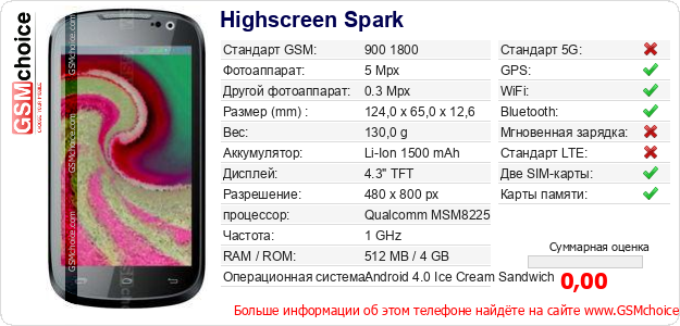 Данные о телефоне Highscreen Spark на Вашем сайте