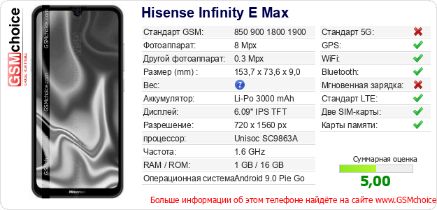 Данные о телефоне Hisense Infinity E Max на Вашем сайте